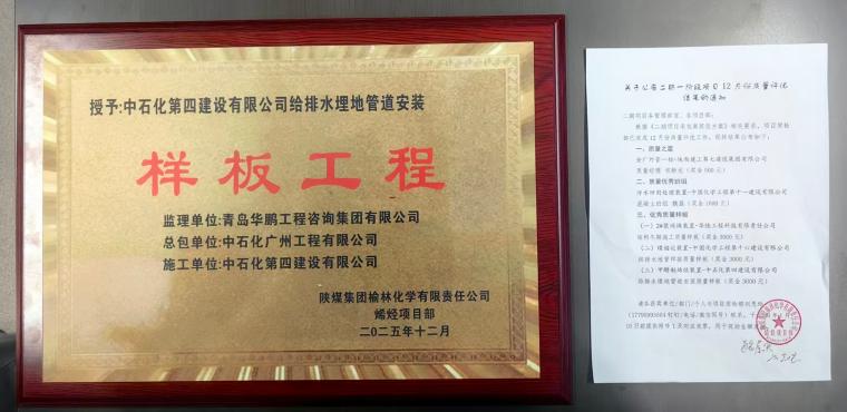 1月8日,在陕煤集团榆林化学有限责任公司召开的2025年12月份质量例会上,中石化四建第二工程公司承建的陕煤榆林化学二期一阶段甲醇制烯烃(MTO)装置给排水埋地管道安装工程获评“样板工程”。