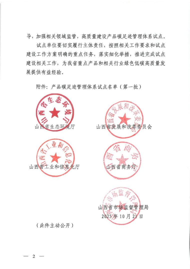 山西省生态环境厅会同相关部门组织专家组,对重点行业企业产品碳足迹管理体系试点申报材料进行严格评审,经公示无异议后确定试点名单,旨在通过试点先行,探索行业产品碳足迹管理的有效路径,推动全省重点产品及产业链绿色低碳转型。