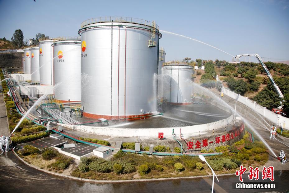 参与演练的中石油攀枝花金江油库是当地最大的油库,库区内储油罐12座,总储量4.5万方。“灭火”演练现场。吴从昊 摄