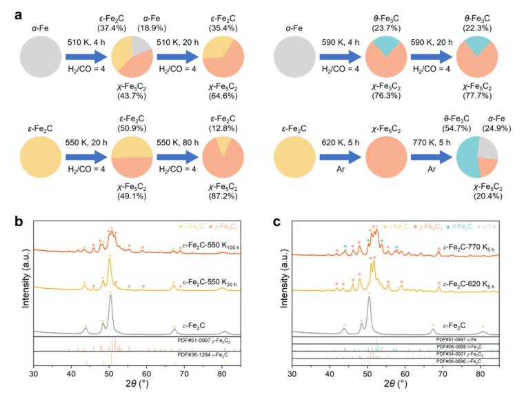 为了实现高原子利用率和催化效率,当前工业催化剂的活性核心组分通常是纳米尺寸的。因此理解催化剂纳米颗粒在反应条件下的物相演化行为,对可持续能源技术中催化剂的理性设计具有重要意义。铁基催化剂在合成气转化及CO₂加氢等领域具有广泛的工业应用。然而在反应气氛下,铁基催化剂通常表现出复杂的物相演化行为,并伴随组分变化。多种碳化相(如θ-Fe₃C、χ-Fe₅C₂、ε-Fe₂C、Fe₇C₃等)的共存与转化,使得其在动态反应条件下的结构稳定性与演化机理长期缺乏系统性认识,从而限制了催化材料的理性设计与性能优化。