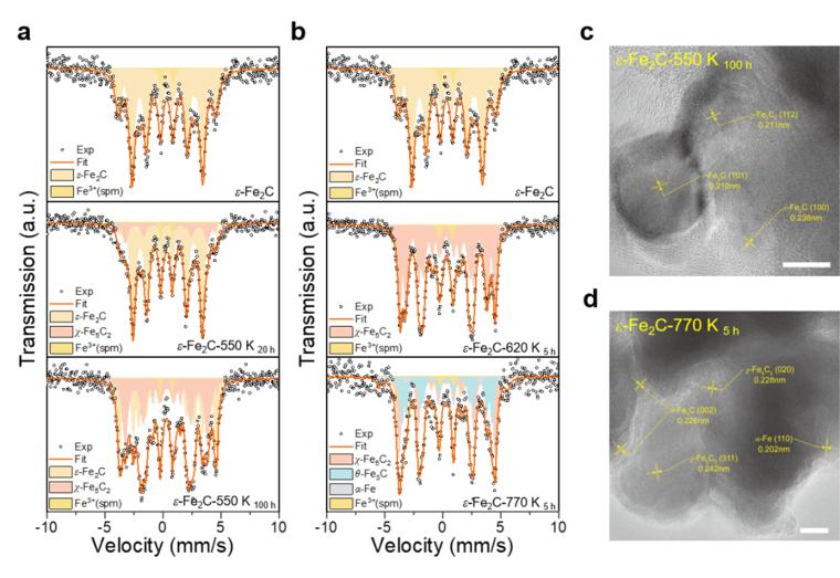 不同实验条件下碳化铁颗粒物相演化的穆斯堡尔谱和高分辨透射电镜表征